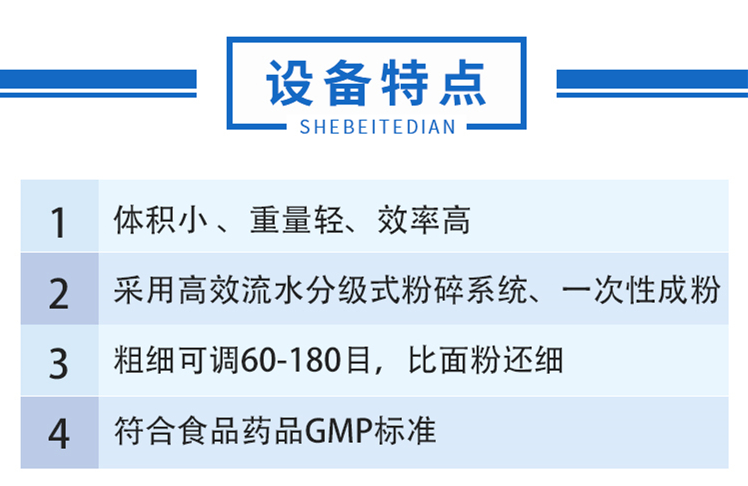 一是粉碎效率高。對(duì)于任何纖維狀、高韌性、高硬度及含水量小于6%的物料均可適應(yīng),能耗低、溫度低,避免發(fā)生物料高溫氧化、變質(zhì)和有效成分的損失和偏析。粉碎過(guò)程全密閉無(wú)粉塵溢出,充分改善作業(yè)環(huán)境。適于中心粒徑為150目?10000目(1.3μm)的粉碎要求,使用特殊工藝時(shí)可達(dá)1?0.1μm 。對(duì)花粉、靈芝孢子粉等孢子類要求打破細(xì)胞壁的物料,其破壁率高于95%。