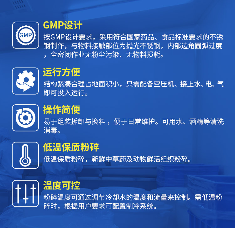 普萊申蜂花粉超微粉碎機系列采用雙桶投料,全自動翻轉(zhuǎn)進料,更省心省力,負壓密封設(shè)計,噪音低,干凈安全。同時采用低溫粉碎技術(shù),保存了物料活性成分,機器采用一體化設(shè)計,節(jié)省空間,更節(jié)能,研磨粉碎方式,可連續(xù)工作16小時。目前采用的是先進的數(shù)控屏幕,操作清晰便捷,操作過程效率高,耗能低,不易損壞。